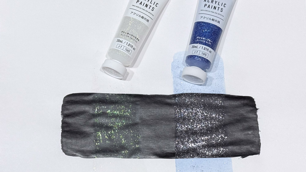 今回はダイソーで見つけたゴールド(メタリックカラー)とラメ入りの絵の具を実際に購入して試してみました。