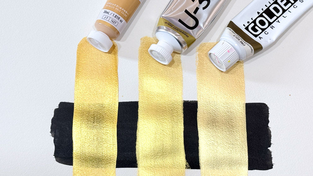 今回は、せっかくなので手持ちの高級アクリル絵具2種と、ダイソーのゴールドを比較してみます