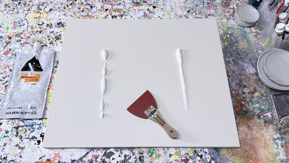 キャンバスに直接出して、へらを使って目地を埋めるようなイメージで伸ばしていきます。